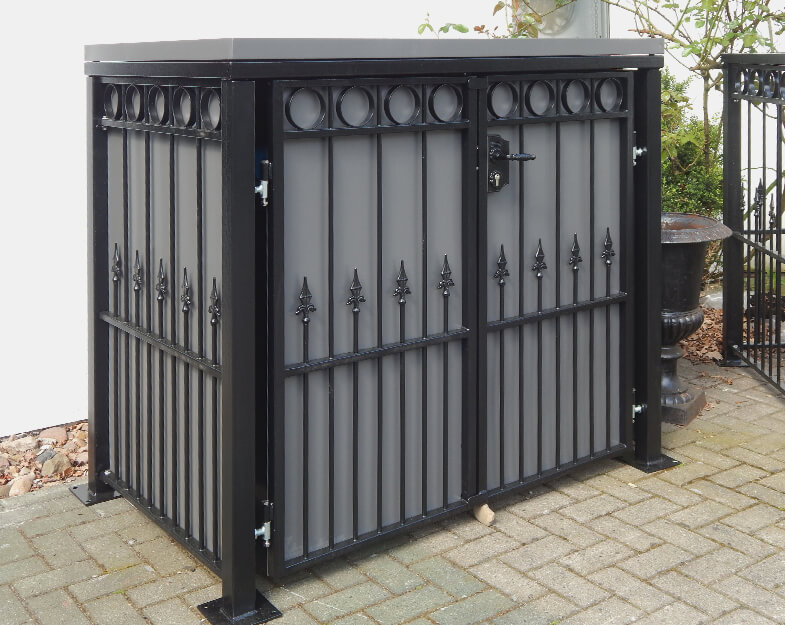 Wir liefern Ihnen die Mülltonnenboxen in verschiedenen Größen und können dabei auch auf Ihren speziellen Wünsche eingehen. Sie können die Boxen mit Platz für ein, zwei oder drei Mülltonnen kaufen. Sie bestechen durch Ihre stabile und robuste Bauweise, die auch bei schweren Wettereinflüssen problemlos standhalten. Außerdem verfügen unsere Schmiedeeisernen Mülltonnenboxen über eine verschließbare Zugangstür, sodass die Benutzung nur für bestimmte Personen gedacht ist. Die hochwertige Verarbeitung verspricht eine langjährige Freude.
