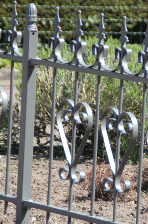 Einreihiger Nostalgiezaun mit Vierkant-stäben, gebogenen Abschlussprofil, geschwungenen Schmiedeelementen und Zierspitzen.